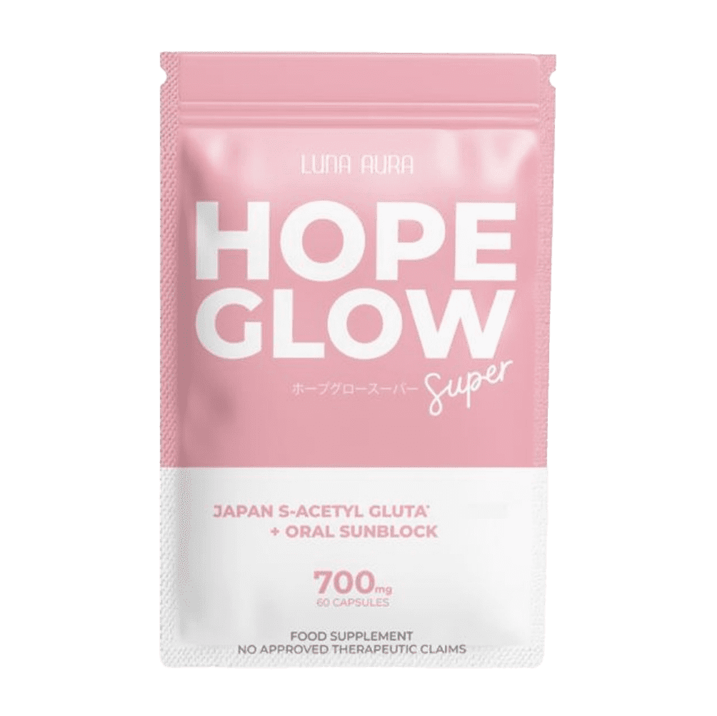HOPE GLOW Super est une capsule beauté premium formulée avec S-acétyl-glutathion du Japon et un écran solaire oral pour éclaircir le teint, soutenir le système immunitaire et protéger contre les rayons UVA/UVB.